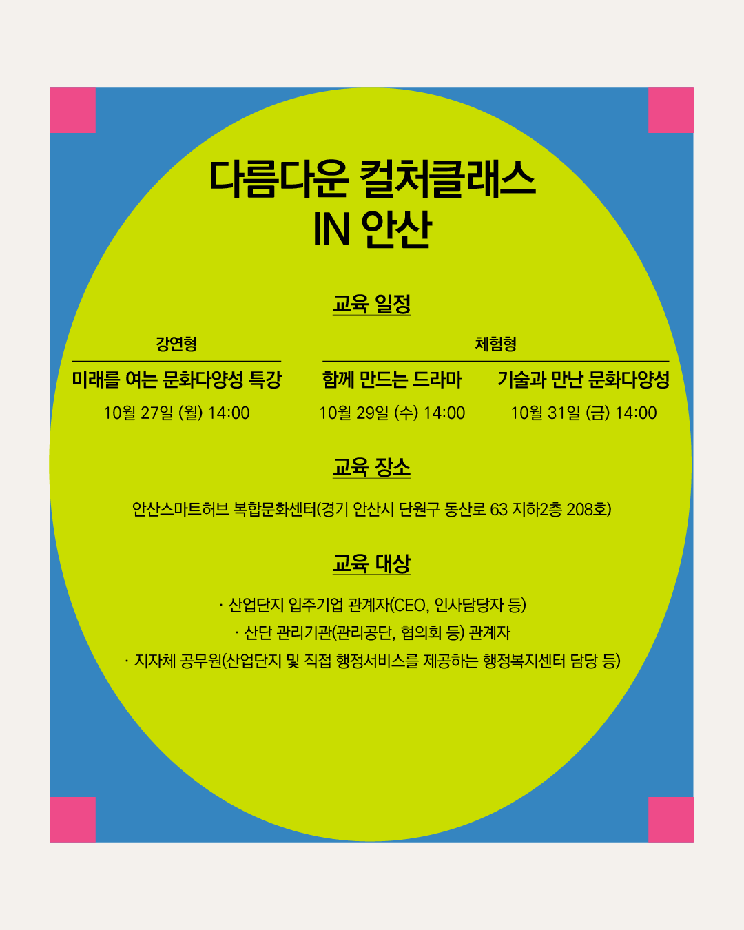 [한국문화예술교육진흥원] 산업단지 문화다양성 이해 교육 <다름다운 컬처클래스 in 안산> 참가자 모집