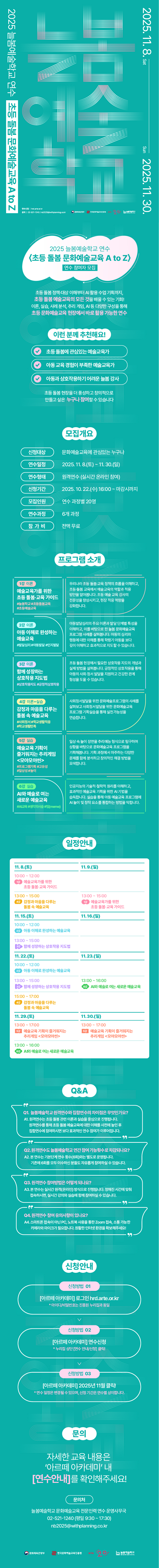 안녕하세요, 늘봄예술학교 문화예술교육 전문인력 연수 운영사무국입니다. 2025 늘봄예술학교 원격연수 <초등 돌봄 문화예술교육 A to Z> 모집 안내드립니다.   본 연수는 초등 돌봄 정책·대상 이해부터 AI 활용 수업 기획까지  이론, 실습, 사례분석, 추리게임, AI 등 다양한 구성을 통해 초등 문화예술교육 현장에서 실질적으로 활용할 수 있는 역량을 강화하고자 합니다.   초등 돌봄 현장을 풍성하게 만들고 싶은 누구나 참여 가능하며 초등 돌봄에 관심있거나  아동 교육 경험이 부족한 예술교육가,  아이들과의 상호작용이 어렵게 느껴지는 늘봄 강사에게 추천합니다.   ✔ 연수신청은 10. 22.(수) 16:00부터 진행됩니다. ✔ 자세한 사항은 ‘아르떼 아카데미’ 내 ‘연수안내/신청’ 페이지를 확인해 주세요! 📞 문의처: 늘봄학교 문화예술교육 전문인력 연수 운영사무국       Tel. 02-521-1240 (평일 9:30~17:30) / E-mail. nb2025@withplanning.co.kr