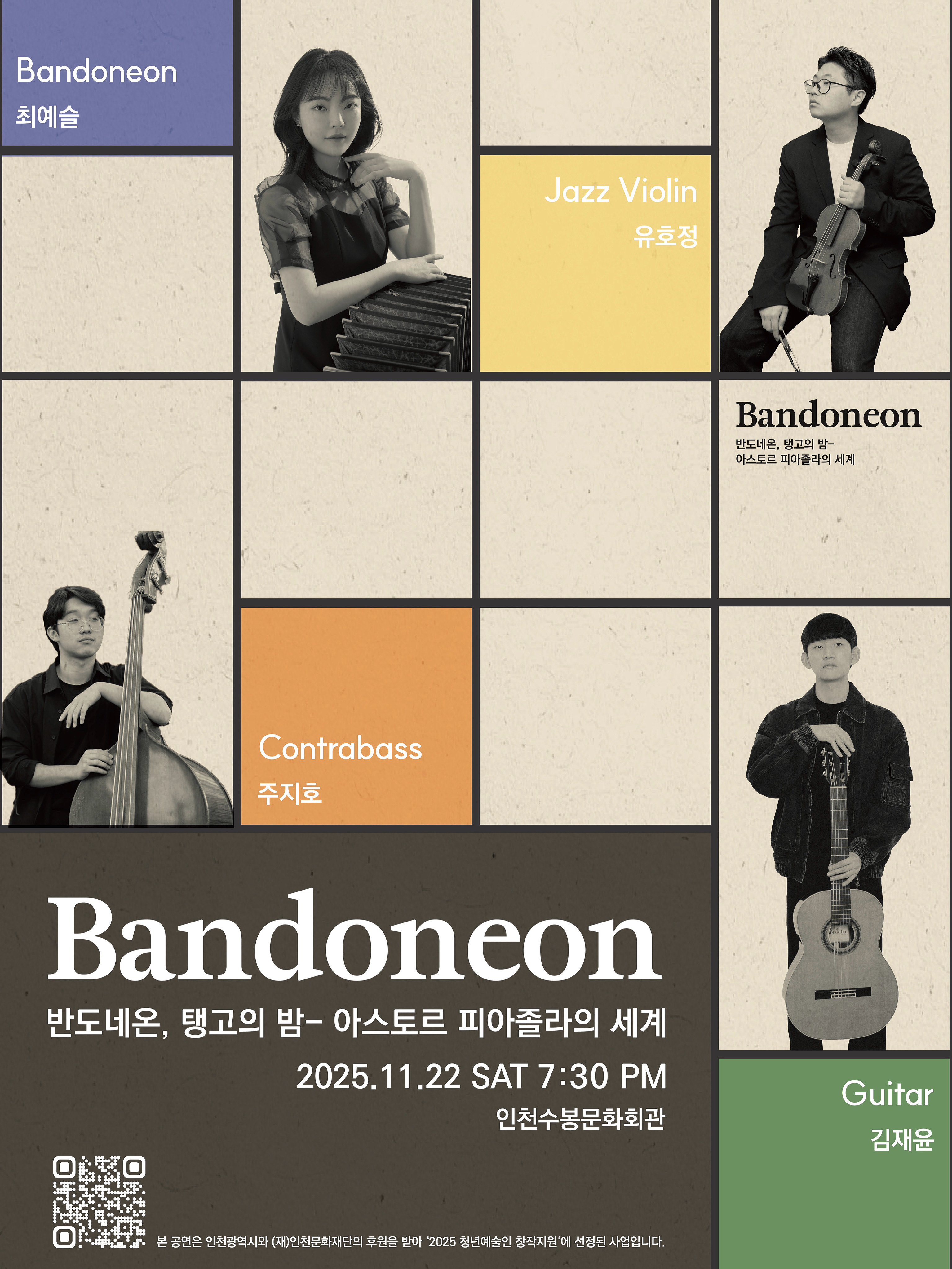 가을밤을 아름다운 탱고 선율로 수놓을 특별한 무대에 여러분을 초대합니다👏🏻🌟인천문화재단의 지원으로 전석 무료로 진행되는 이번 공연을 통해 뜨거운🔥탱고의 열기 속에서 예술적 영감을 나누고 소통하는 아름다운 밤이 되기를 바랍니다. 🙌