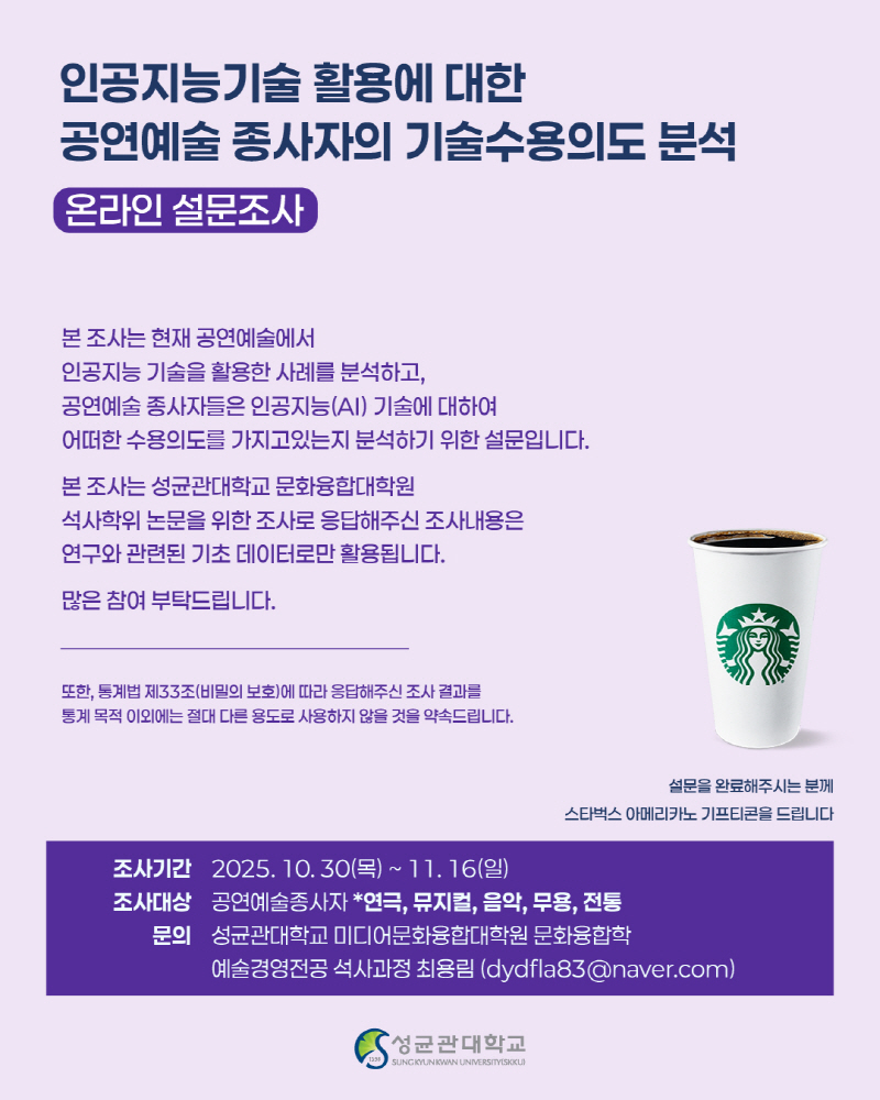인공지능기술 활용에 대한 공연예술 종사자의 기술수용의도 분석에 관한 온라인 설문조사 참여자 모집의 글