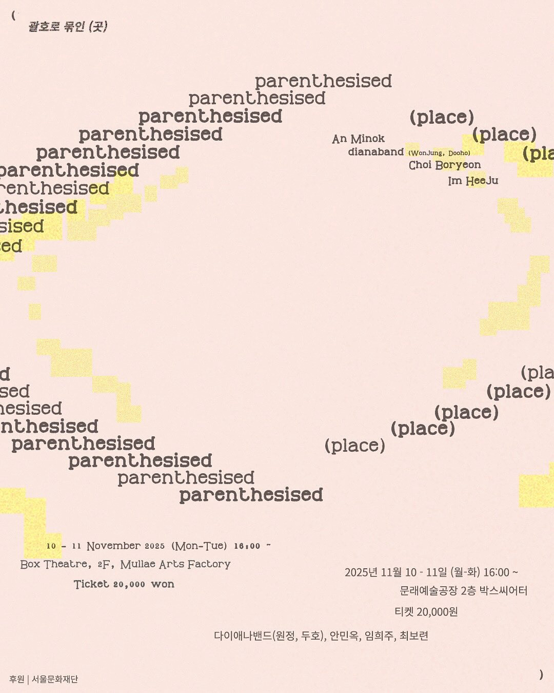 서울시 마포구 성산동에 자리한 문래예술공장 2층 씨어터에서 임희주가 기획하고 ‘다이애나밴드 (원정, 두호), 안민옥, 임희주, 최보련’가 참여하는 《괄호로 묶인 (곳)》이 다음 주 월요일 개최 예정입니다. 🔥 이틀이란 짦은 기간 진행하는 행사이니, 관심이 있으신 분들은 미리 살펴보시고 예약을 하실 수 있길 바랍니다.