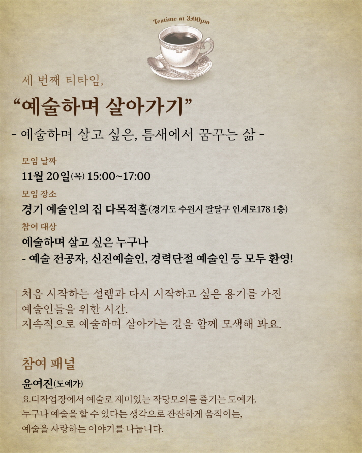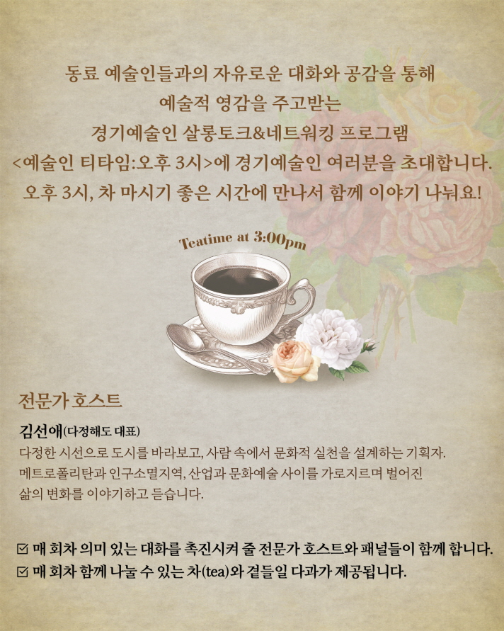 동료 예술인들과의 자유로운 대화와 공감을 통해 예술적 영감을 주고받는 경기예술인 살롱토크&네트워킹 프로그램 <예술인 티타임:오후 3시>에 경기예술인 여러분을 초대합니다. 예술인 여러분의 많은 관심과 참여 부탁드립니다. 이번 3회차는 더 많은 예술인들과의 만남을 위해 참여 대상을 확대했습니다. 서로의 경험과 이야기를 나누며 예술적 영감을 얻는 시간을 함께해요. 자세한 내용은 아래 상세페이지에서 확인해 주세요. 🌿