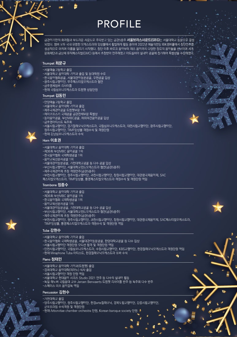 금관악기만의 화려함과 부드러운 사운드로 주목받고 있는 금관오중주 서울브라스사운드(SBS)는 서울대학교 동문으로 결성되었다.