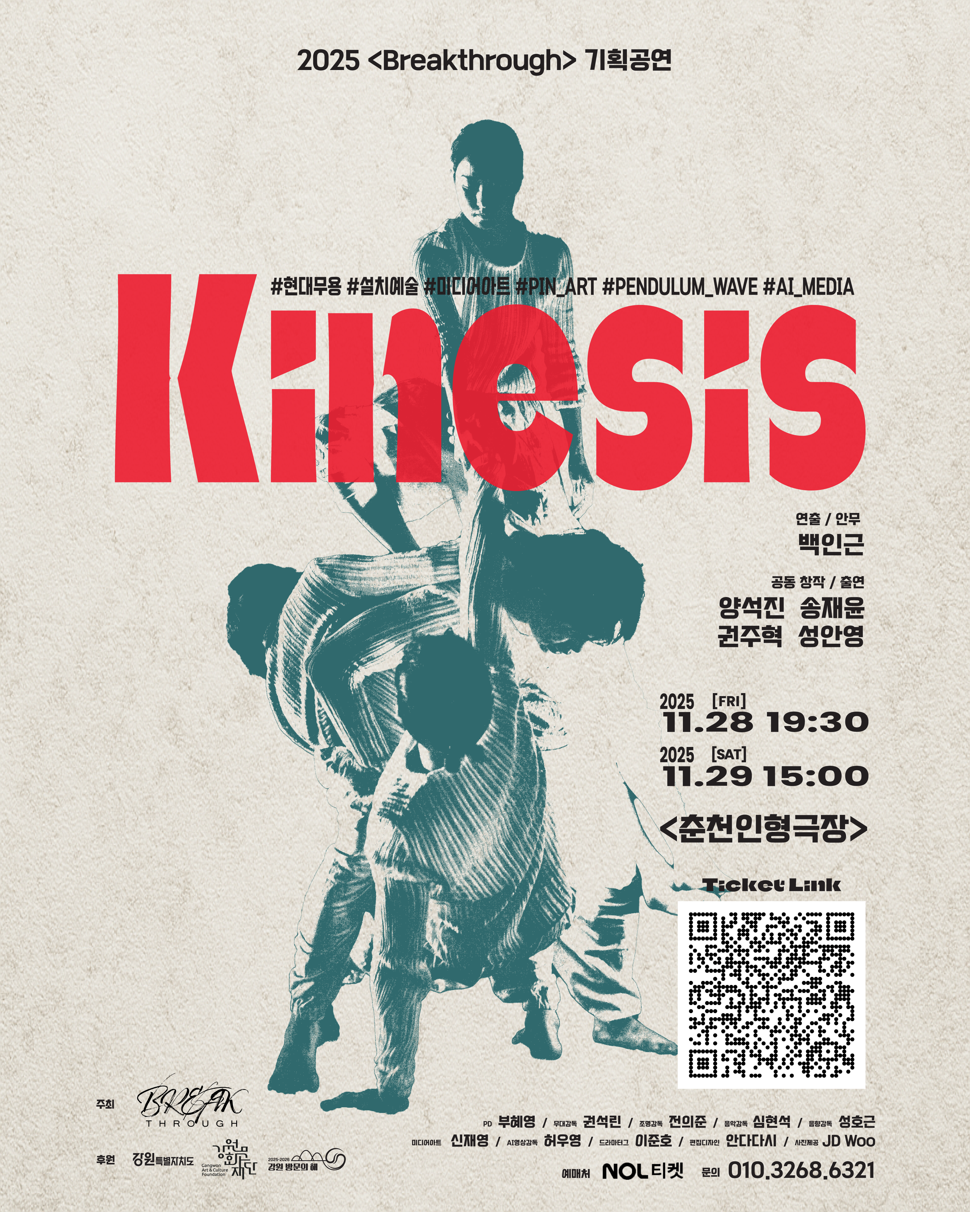 • Breakthrough? Breakthrough는 “우리는 돌파구를 찾아 강행돌파한다.”라는 슬로건 아래, 예술의 경계와 사회의 고정관념, 기술의 한계를 돌파하는 창작 철학을 지향한다. 신체와 오브제, 공간을 매개로 새로운 예술 형식을 탐구해온 움직임 기반 창작 단체로, 이번 〈Kinesis〉는 그간의 실험적 연출 경험을 집약한 무대이자 변화의 시대에 인간의 창조적 주체성을 지켜내고자 하는 시도다.