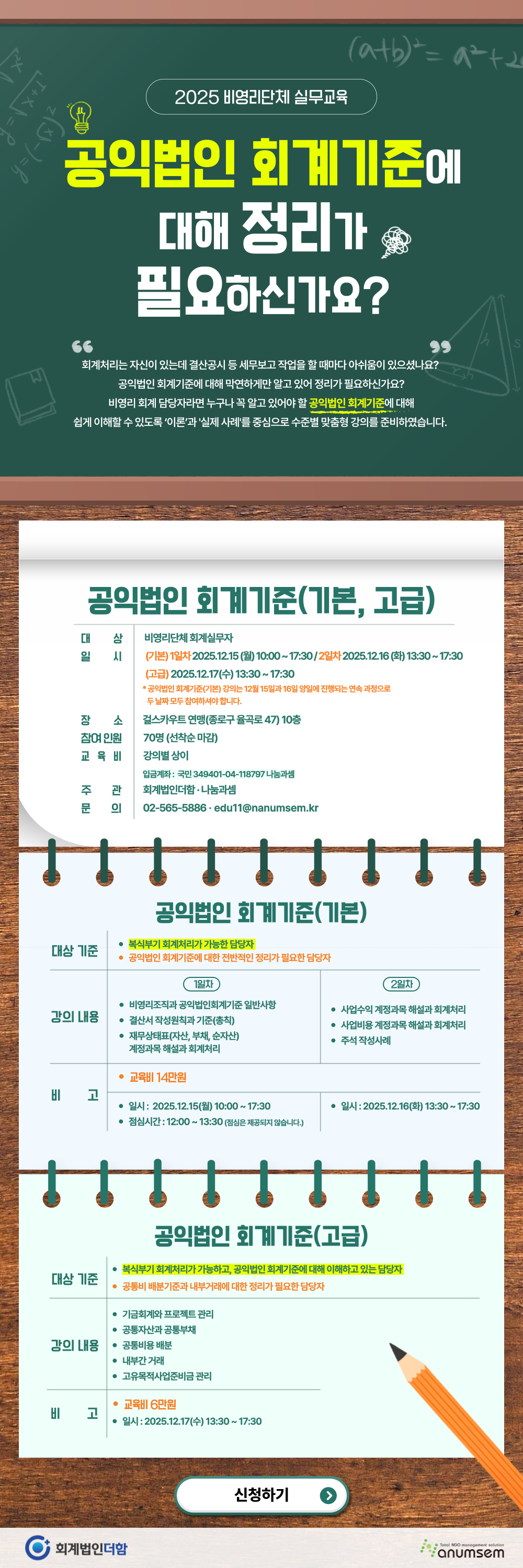 일시 : 강이별 상이(공익법인 회계기준(1)강의는 12월 15일과 16일 양일에 진행되는 연속 과정으로, 두 날짜 모두 참여하셔야 합니다.)