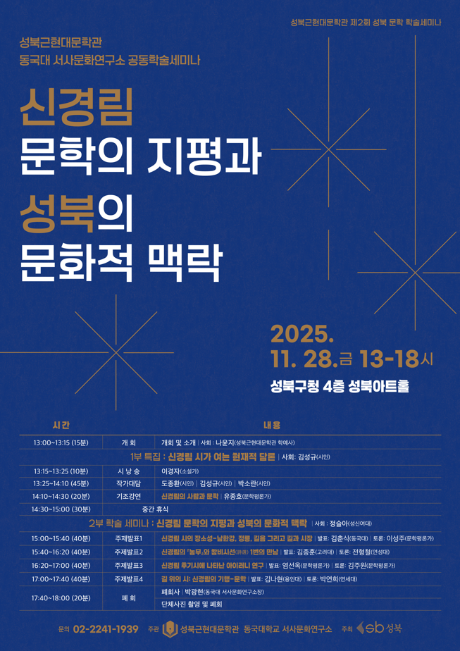 다가오는 11월 28일, 성북구청 4층 성북아트홀에서 성북근현대문학관과 동국대 서사문화연구소의 공동 학술세미나 <신경림 문학의 지평과 성북의 문화적 맥락>이 개최됩니다.