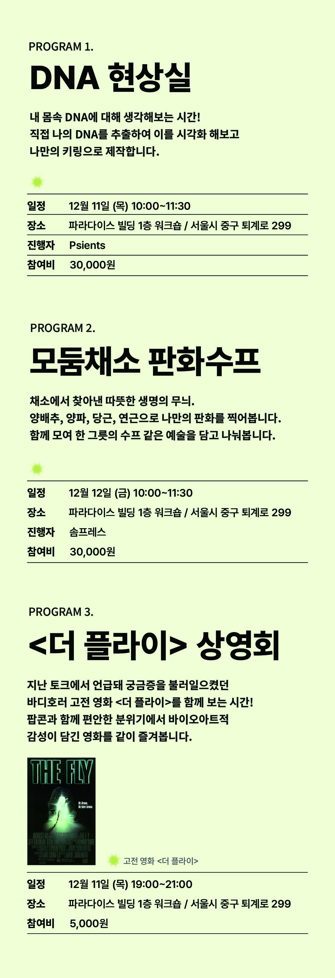 ✔기간: 2025.12.11.(목) - 12.12.(금) 12:00-18:00 ✔장소: 서울시 중구 퇴계로 299, 1층 ✔내용: -바이오아트 워크숍 결과물 전시 - 워크숍 & 커뮤니티 프로그램 - 가벼운 바이오아트적 즐길거리들 - 세포집 MD 판매