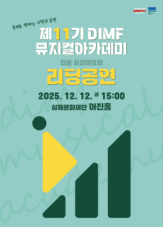 최종 성과발표회 <리딩공연> - 일 시 : 2025년 12월 12일(금) 15:00 - 장 소 : 심해문화재단 아진홀 (대구 수성구 알파시티1로31길 25) - 관람등급 : 초등학생 이상 - 입 장 : 무료 (신청자에 한함 / 최대 1인 2매) - 작 품 : 창작뮤지컬 7작품