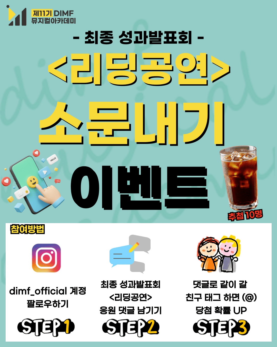 ✅참여방법 1️⃣ dimf_official 인스타 계정 팔로우 하기 2️⃣ 최종 성과발표회 <리딩공연> 응원 댓글 남기기 3️⃣ 댓글로 같이 갈 친구 태그 하면 (@) 당첨 확률 UP‼️