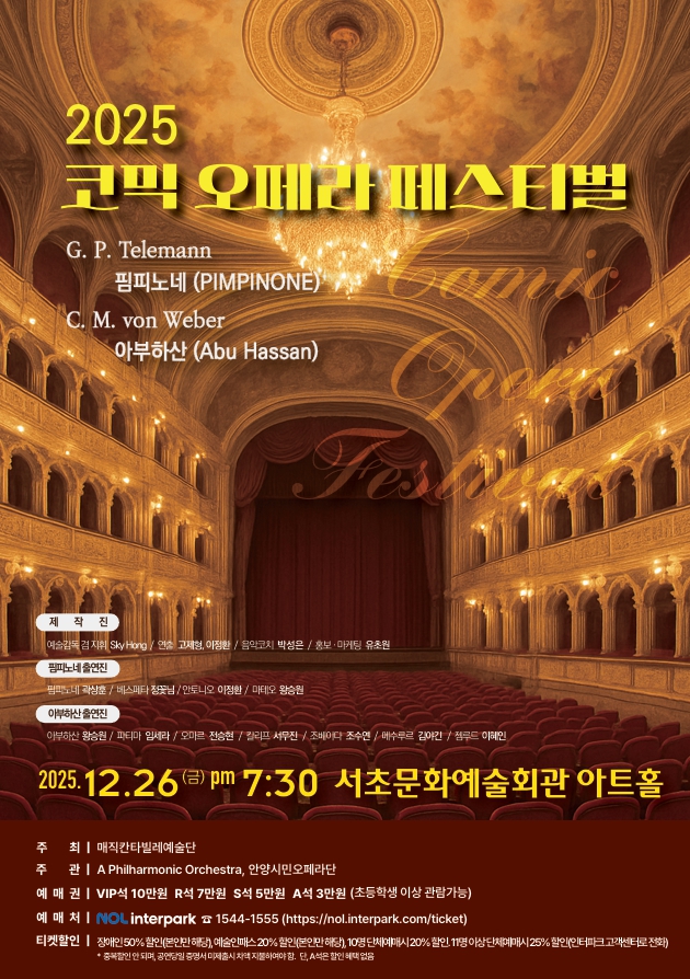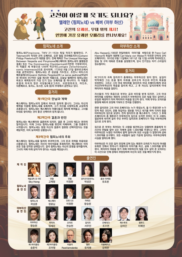 텔레만의 <핌피노네>와 베버의 <아부하산>을 한자리에서 만나볼 수 있는 이번 공연은 가볍고 친근한 매력의 오페라를 통해 연말의 특별한 무대를 선사합니다.