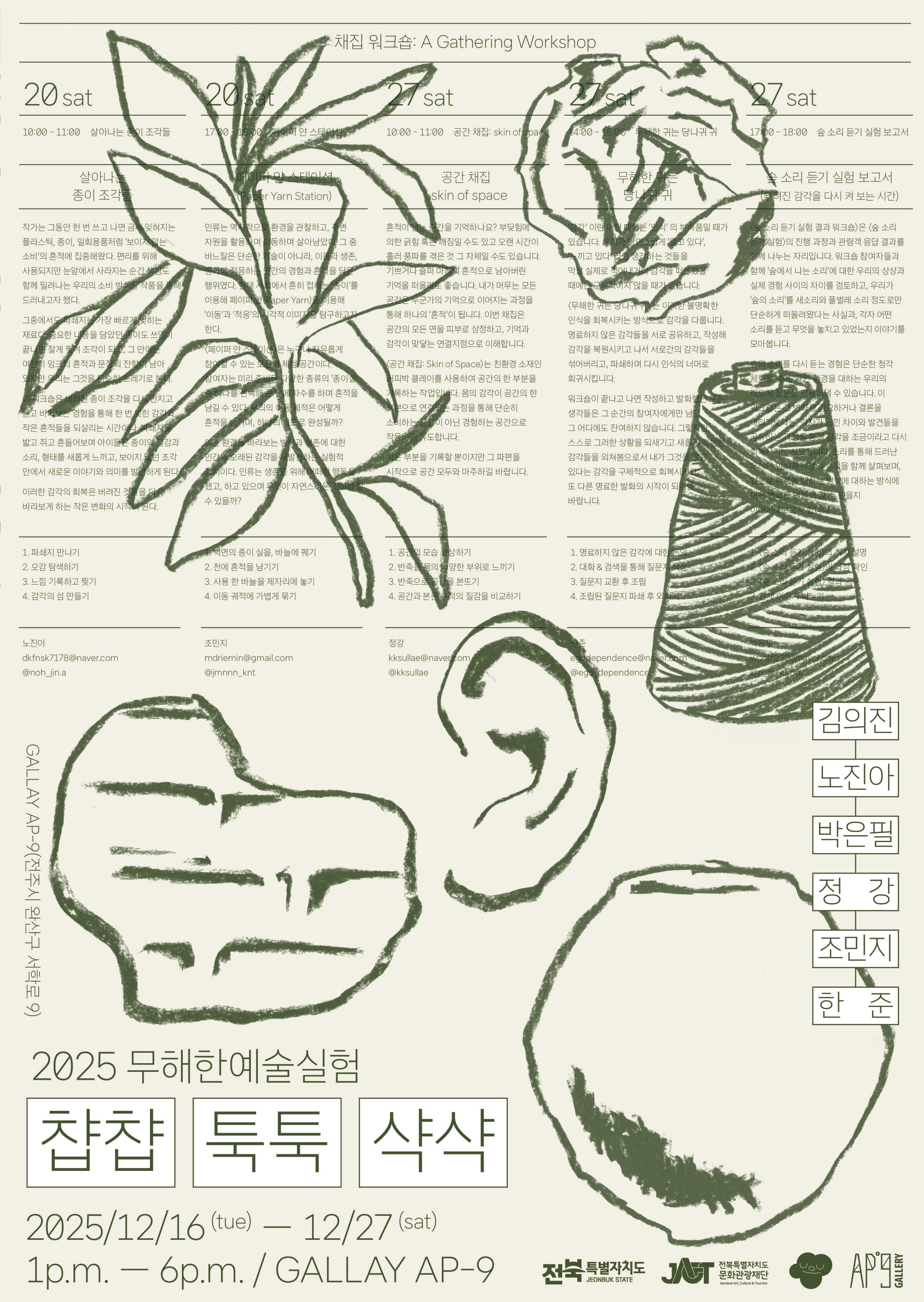 환경과 생태를 둘러싼 다양한 담론들은 우리 삶에 깊숙이 자리잡고 있지만, 정작 우리는 그것을 명료히 ’감각‘ 하지 못한 채 살아가고 있습니다. 다양한 방식으로 환경 문제를 다루는 시각예술 프로젝트그룹 <무해한 예술실험> 은 ’무해한, 친환경적인, 지속가능한‘ 등의 재료를 중심으로 하는 예술 실험 과정에 한계를 느꼈습니다. 재료만의 고민을 넘어, 담론에 선행되어야 했던 환경과의 연결감 자체가 부재한다는 전제를 갖고, 당연스레 선행되어야 했던 ’감각적 관계망의 회복‘ 을 목적으로 전시 《챱챱 툭툭 샥샥》을 준비했습니다. 전시 《챱챱 툭툭 샥샥》은 ’ 오늘날 우리는 기후 변화를 감각하고 있는가? ‘ 라는 질문을 갖고, 채집이라는 방법으로 실험을 진행해, 인간과 자연의 관계 속 무뎌진 감각을 다섯 가지 워크숍을 통해 회복하고자 합니다. 참여 예술가들은 예술이 어떠한 감각적 회복의 언어를 가질 수 있는지 실험하고, 작업과 실험 과정의 일방향 전달만이 아닌 관람자와 더 깊게 상호할 수 있는 방법들을 고민하였고, 아카이빙 전시와 각 작가들의 워크숍들을 통해 무뎌진 감각들을 재구성하고 사물과 인간 사이의 감각적 관계망을 다시 형성하는 것을 목표로 합니다.