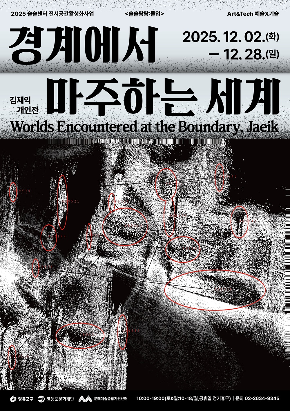 이번 전시 《경계에서 마주하는 세계》는 산업의 흔적과 예술 공간, 거주와 이주, 개발과 쇠퇴가 교차하는 문래동에서 일상의 장면과 비결정적 감각을 탐구하는 전시이다. 작가는 2024년 문래동 일대를 리서치하며 공장 밀집지에서 예술과 생활공간이 뒤섞인 현재에 이르기까지의 변화를 추적하고, 거리에서 마주친 장면과 소리, 데이터, 오브제를 채집해 작업의 재료로 삼았다. 작가에게 이 지역은 단순한 물리적 공간을 넘어, 삶의 보금자리이면서 동시에 언제든 균열이 드러날 수 있는 양가성이 켜켜이 포개진 불안한 정서적 지면이다. 그는 이곳에서 포착한 이미지와 사운드, 수치와 로그를 수집해 새로운 기호 체계로 전환하는 과정에서, 시스템의 흐름이 미세하게 빗나가며 생기는 ‘버그’와 ‘글리치’를 발견한다. 김재익은 이러한 이상 흐름을 오류나 기능의 실패가 아니라, 기존 의미 구조에 틈을 내고 다른 가능성을 불러오는 징후로 읽어내며, 이 어긋남을 증폭해 데이터와 사운드, 빛과 구조를 통해 문래의 풍경을 재구성한다. 그렇게 만들어진 장면들은 익숙한 도시의 표면 아래 잠재해 있던 감각과 의미를 드러내는 동시에, 오늘날 도시가 어떤 위태로운 균형 위에서 유지되고 있는지, 그리고 세계가 자신을 드러내는 방식이 어떻게 변형되고 있는지를 묻는 하나의 실험적 장치로 작동한다.