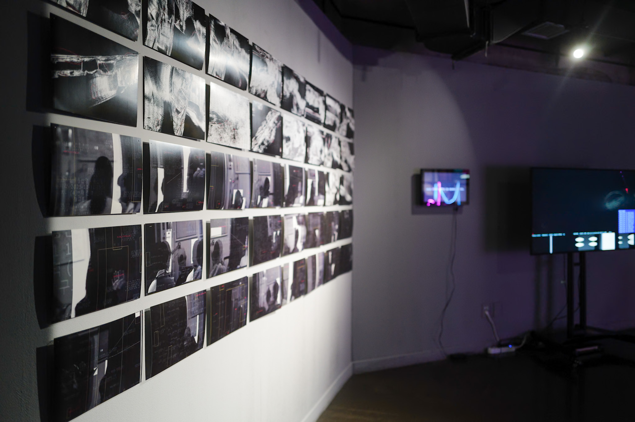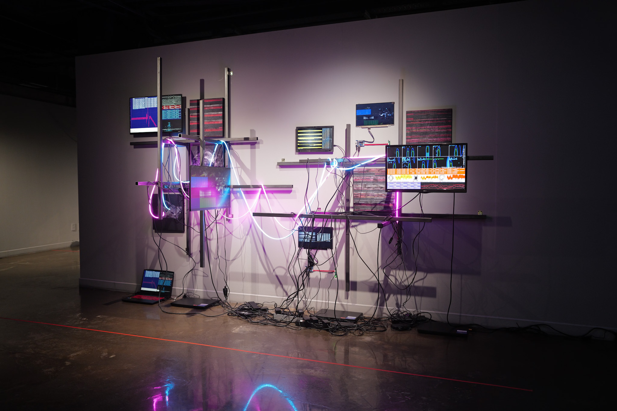 문래‧영등포의 지형을 출발점으로 하는 〈집적의 서식지 – The Nest Cluster〉와 〈맥동하는 로컬리티〉 시리즈는 거리의 깊이와 음영, 교통 혼잡도, 발걸음의 흐름, 대기 환경 등 도시에서 수집된 데이터를 사운드, 영상, 회화의 리듬으로 전환한다. 금속 구조물과 케이블, 멀티채널 사운드가 뒤엉킨 설치는 산업과 예술, 거주와 이주의 흔적과 기억이 뒤섞인 장소로 소리와 구조, 빛으로 응축해 하나의 환경으로 제시된다. 이어지는 평면 회화와 멀티미디어 설치에서는 데이터가 더 이상 통계 그래프의 추상적 수치가 아니라, 출렁이는 선과 떨리는 점, 불규칙한 점멸의 패턴으로 나타나며 도시를 호흡하고 진동하는 유기체로 만든다. 〈리듬의 생태학 – 쓸림, 깜박임, 숨 고르기〉에서 영등포 일대 지하철 역사 내부의 CCTV 푸티지, 조명의 깜박임, 통행과 정지의 흐름은 여러 대의 스크린과 데이터 렌더링 화면 위에서 중첩되고 분기되며, 교환과 순환, 축적과 소진이 반복되는 도시의 리듬을 하나의 ‘리듬-생태’로 구현한다.