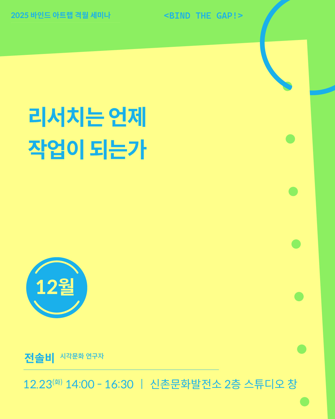 📂 세미나 정보 - 일시 : 2025.12.23.(화) 14:00~16:30 (2시간 30분) - 장소 : 신촌문화발전소 2층 스튜디오 창 - 참가비 : 4만원 (학부생 할인 2만 5천원) - 인원 : 최대 10명