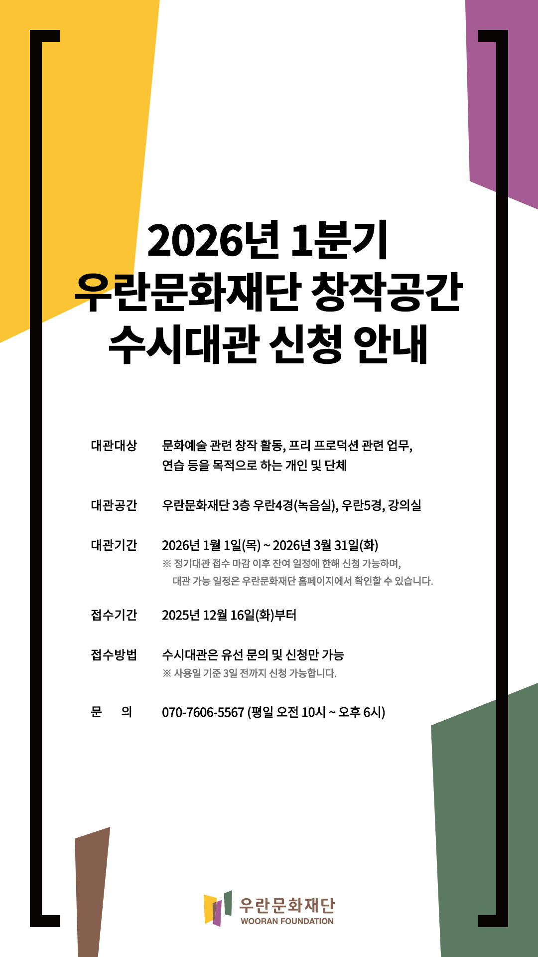 [우란문화재단] 2026년 1분기 창작공간 수시대관 신청 안내