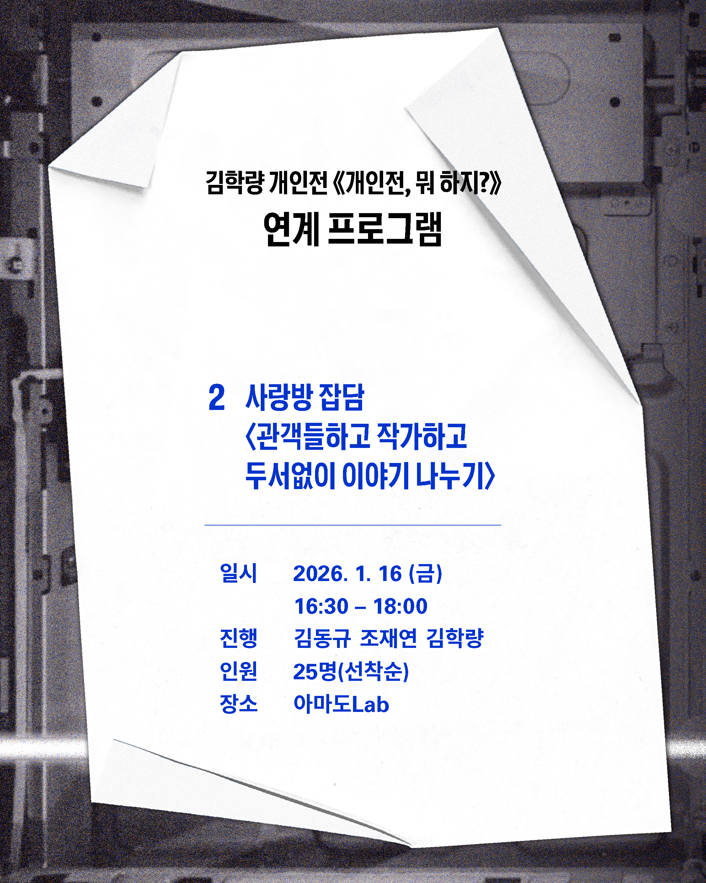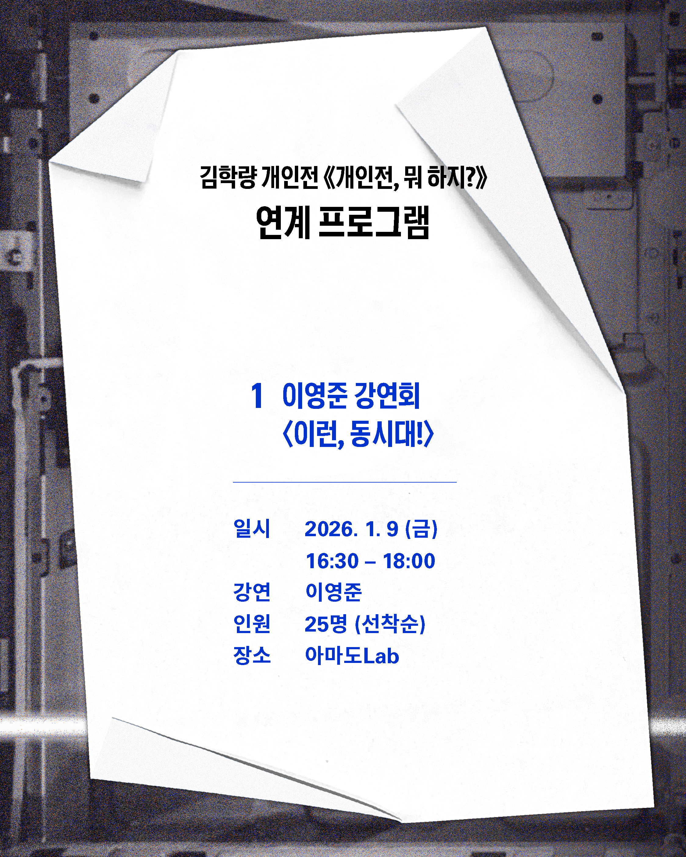 아마도예술공간은 김학량 개인전 《개인전, 뭐 하지?》의 연계 프로그램 ① 이영준 강연회 〈이런, 동시대!〉, ② 사랑방 잡담 〈관객들하고 작가하고 두서 없이 이야기 나누기〉에 참여할 사람을 모집합니다. 더불어 오는 2026년 1월