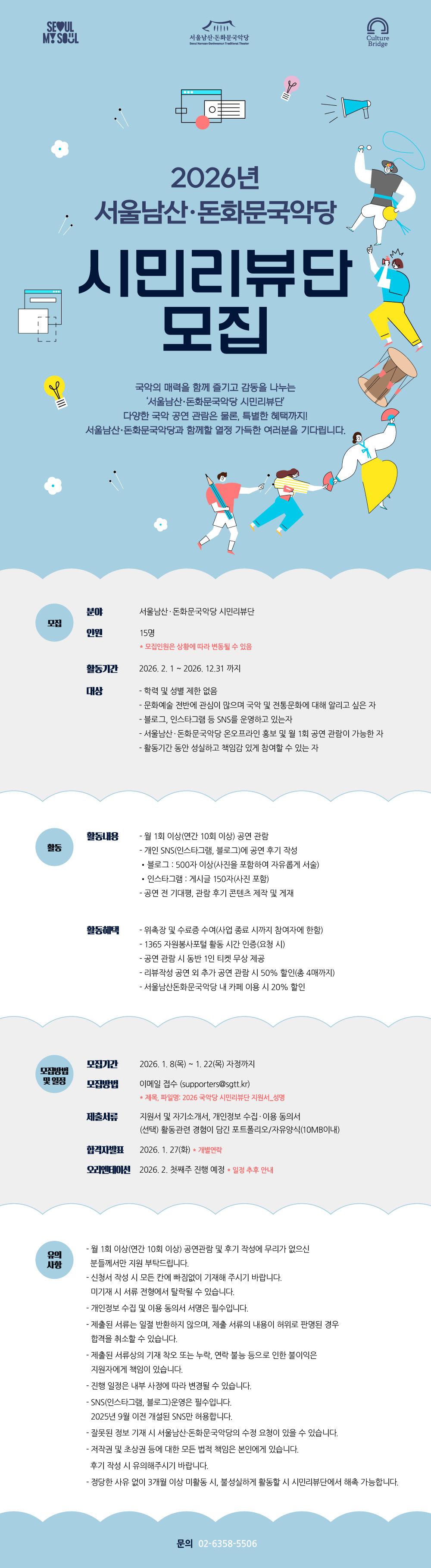 - 메일 제목 및 파일 이름 : 2026 서울남산돈화문국악당 시민리뷰단 지원서_OOO(지원자 이름)