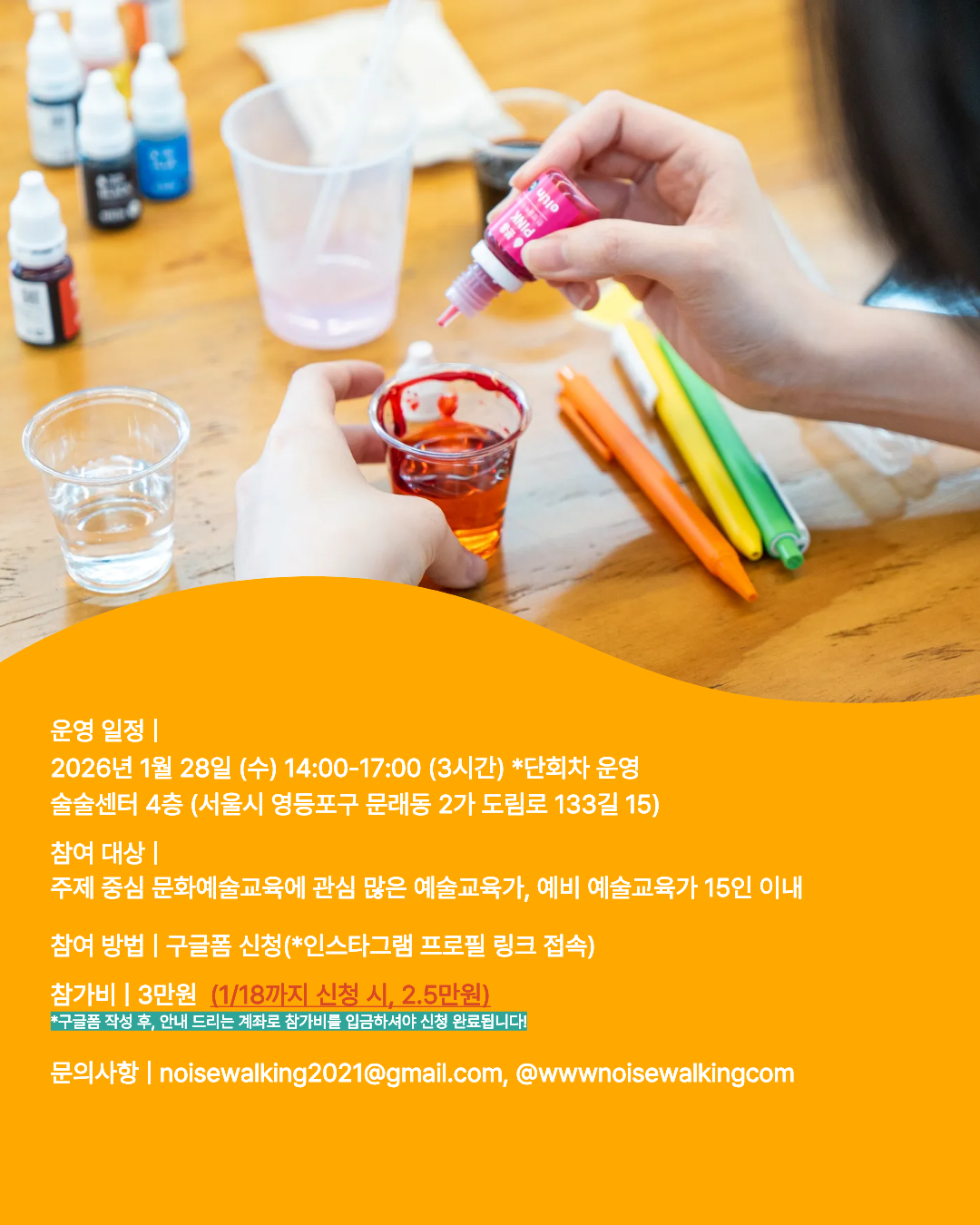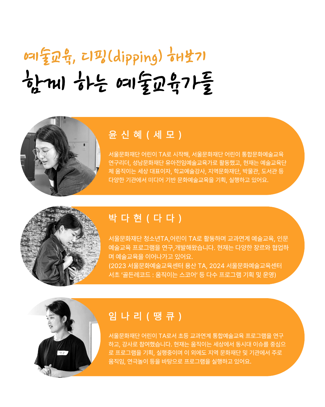 📍대상 ✔️예술교육에 관심이 있거나, 막 진입한 예술교육가 ✔️동시대 예술교육의 의미를 고민하고 있는 분 ✔️함께할 동료를 만나고 싶은 예술교육가