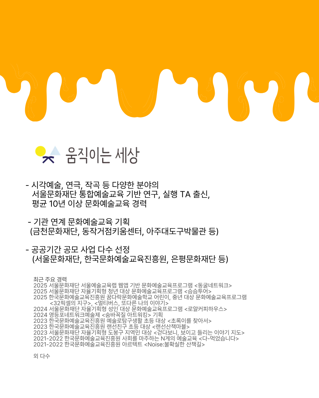 📍워크숍에서는 이런것들을 해요 - 장르를 넘나드는 동료 예술교육가 네트워킹 - 나의 관심사로 시작하는 기획 아이데이션 - 단체 ‘움직이는세상’의 예술교육 기획 과정과 사례 공유