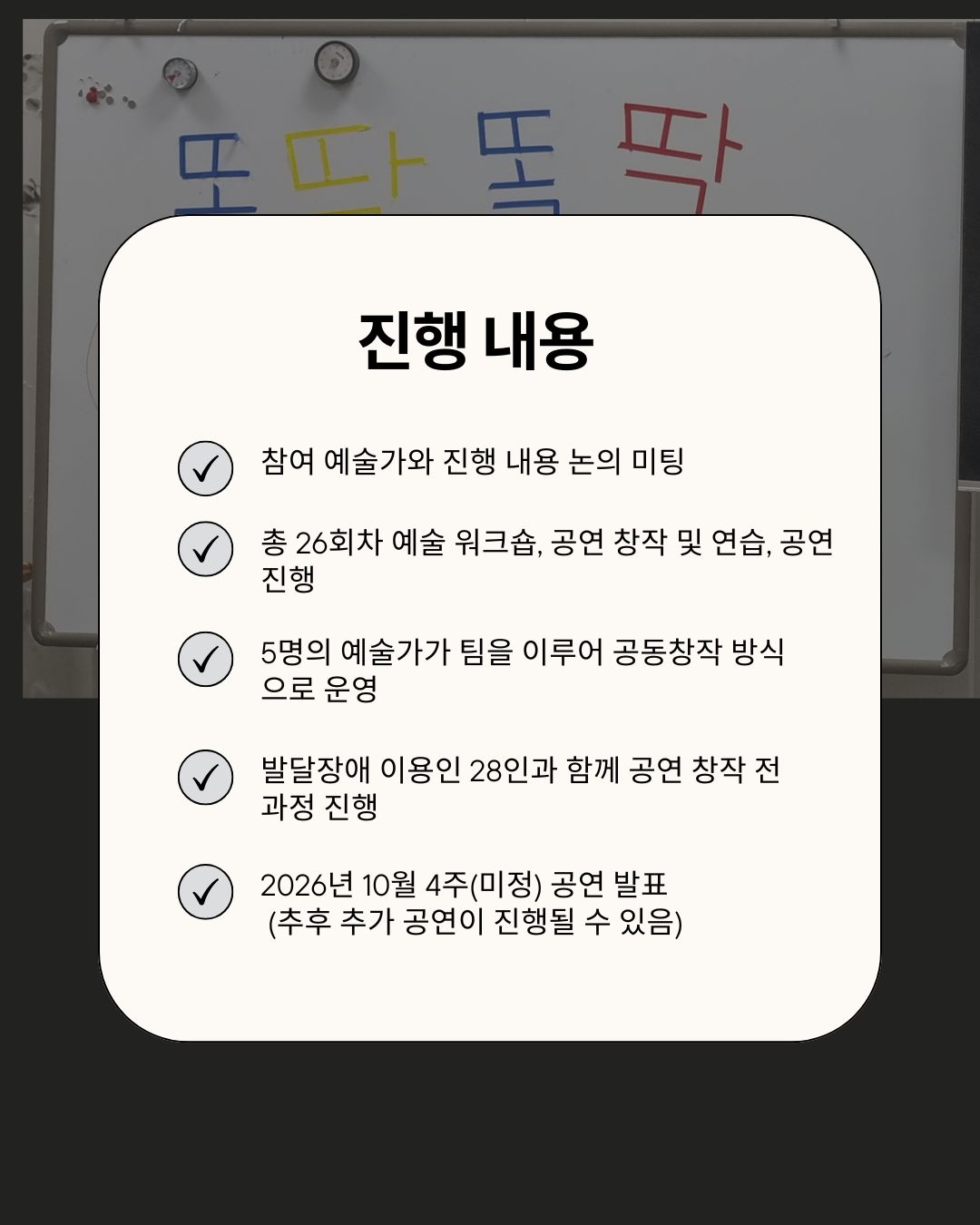 - 총 26회차 예술 워크숍, 공연 창작 및 연습, 공연 진행