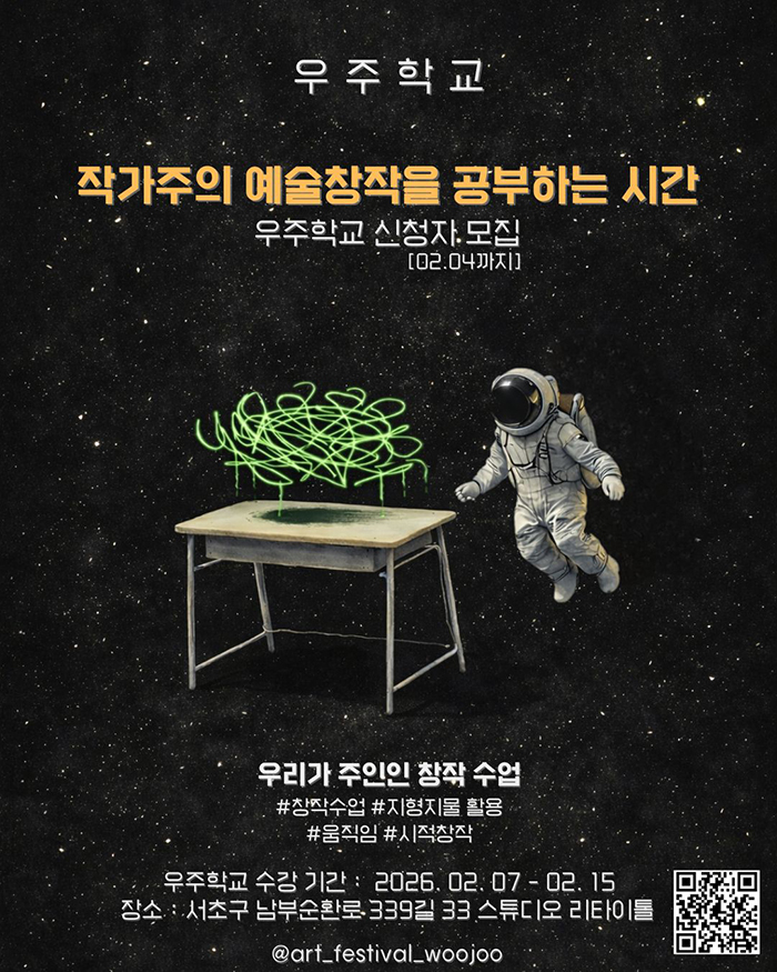 ▼‘우주학교’ 참가자 모집 (2월4일까지 신청!) 우주학교는 우리가 주인인 ‘우주축제’가 런칭하는 예술창작학교입니다. 2026년 2월 7~15일 진행되는 ‘우주학교’(2026 겨울) 참가자를 모집합니다. ▼‘우주학교’는? - 우리가 주인인 ‘우주축제’가 런칭하는 예술창작학교입니다. - 우주축제는 ‘연간 우주축제’와 ‘격월간 우주축제’를 통해, 지난 1년 반 동안 40개의 신작을 발표해 왔습니다. - 새로운 형식의 예술창작의 욕구를 채워줄 창작교육 시스템을 실험합니다. - 이번 과정의 결과물 중 일부는 2월28일 제8회 ‘격월간 우주축제’에서 발표될 예정입니다. *우주축제 인스타 – https://instagram.com/art_festival_woojoo *제1회 연간 ‘우주축제’(2025년7월) - 하이라이트 영상 https://youtu.be/7J__lYZOcos ▼강좌 소개 *비주얼씨어터 창작방법 (이철성) 텍스트가 아닌 ‘예술재료’로부터 작품을 만드는 창작방법 *랑가주 : 언어적 움직임 창작 (양석진) 언어의 구조를 활용해 메시지를 움직임으로 표현하는 창작 방법론 *지형지물-움직임 창작 (김찬희) 지형지물을 활용한 즉흥 움직임과 움직임 창작법 *시와 공연창작 (이철성) 예술의 본질인 ‘시적’ 울림을 공연창작에 구현하는 방법 ▼장소 & 일정 장소 : 스튜디오 리타이틀 (서울시 서초구 남부순환로 339길 33 지하) 일정 : 2026월 2월 7~15일 ▼강좌세부 & 신청 & 문의 - 신청기간 : 2월4일(수)까지 - 강좌세부 & 신청방법 & 참가비 : https://fms.gle/ssLDWMW6yVfYBAe28 - 문의 : 인스타 @art_festival_woojoo DM 혹은 010-2396-1020 / 각 강좌문의는 구글폼 내 강사 전화번호로.