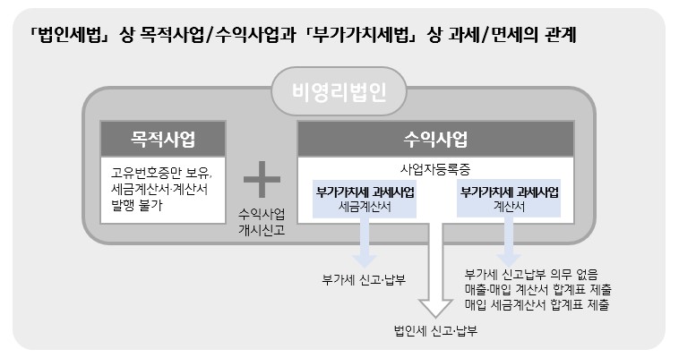 따라서 비영리법인에서 정관으로 정한 고유목적사업이 「법인세법」에서는 수익사업으로 분류될 수도 있습니다. 예를 들어 예술의전당의 정관에서 정한 고유목적사업에는 ‘대관’이 있지만, 「세법」에서는 ‘대관’을 수익사업으로 분류합니다.