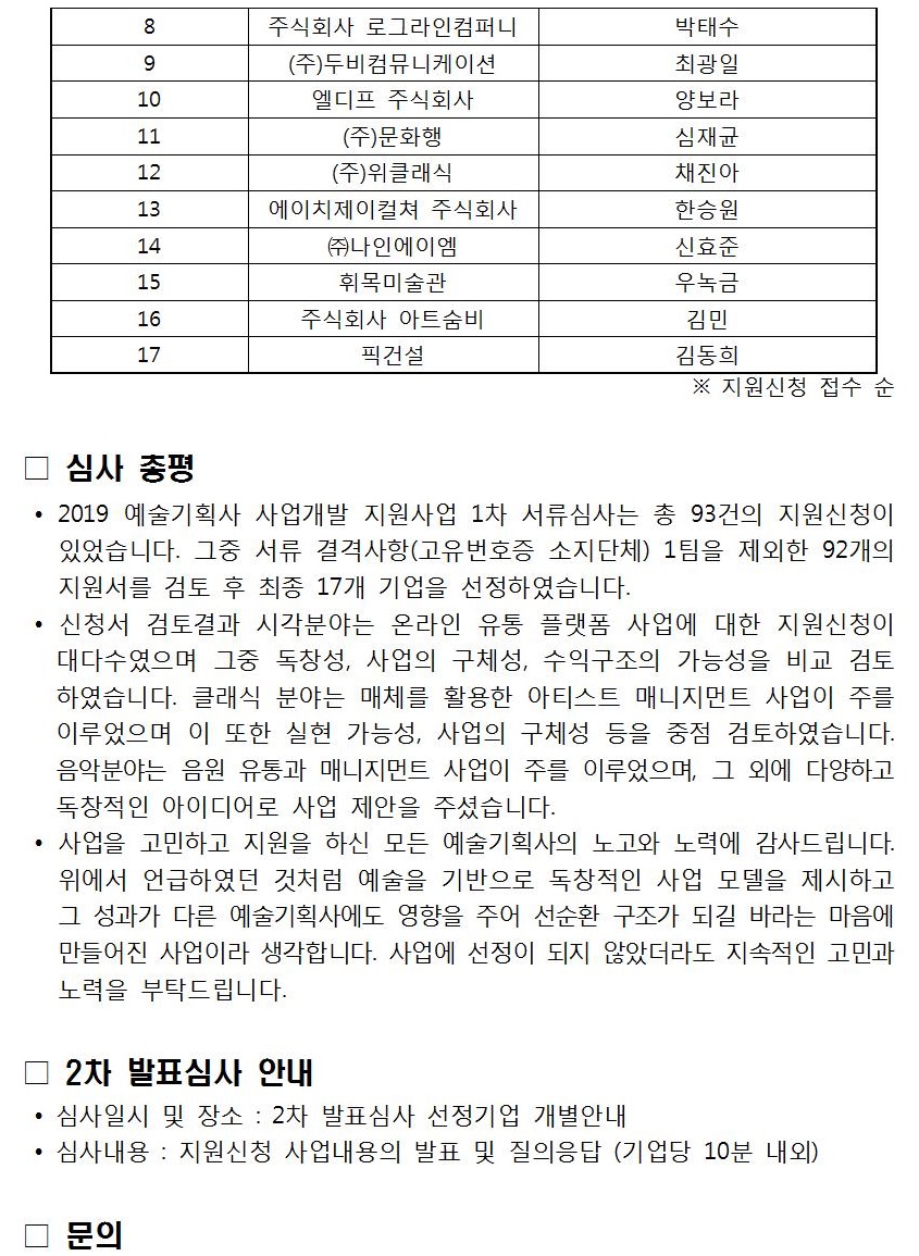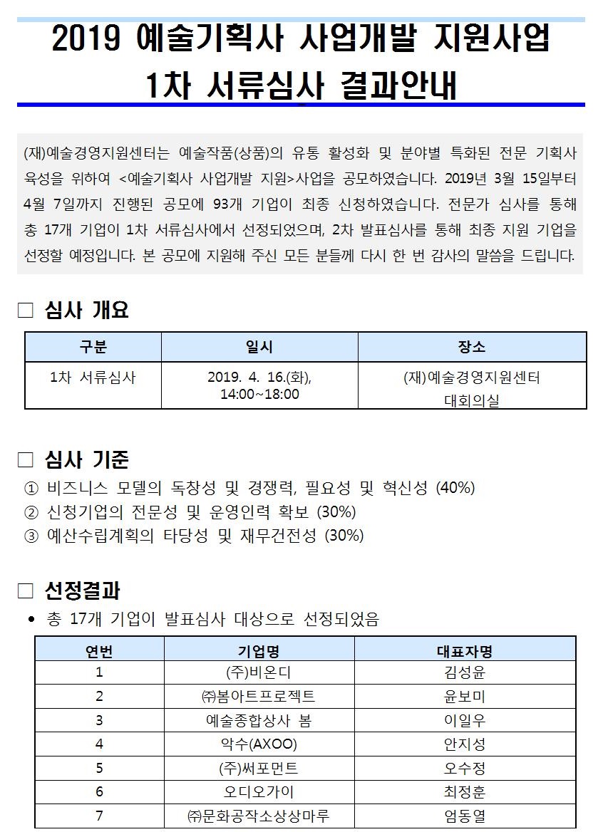 2019 예술기획사 사업개발 지원사업 1차 서류심사 결과 안내