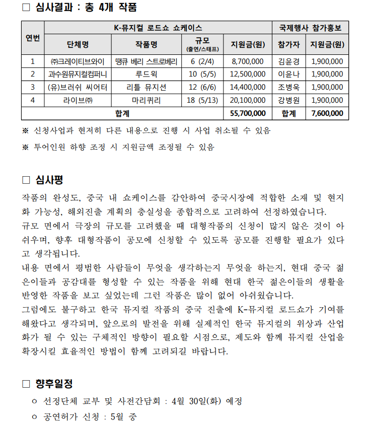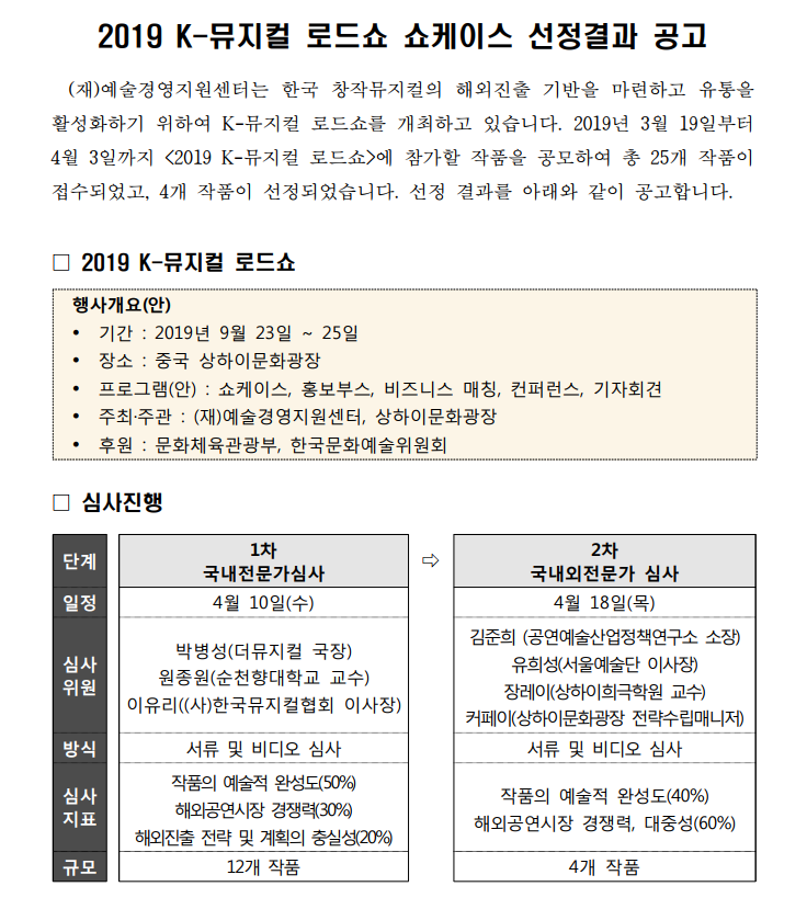 2019 K-뮤지컬 로드쇼 쇼케이스 선정결과 공고