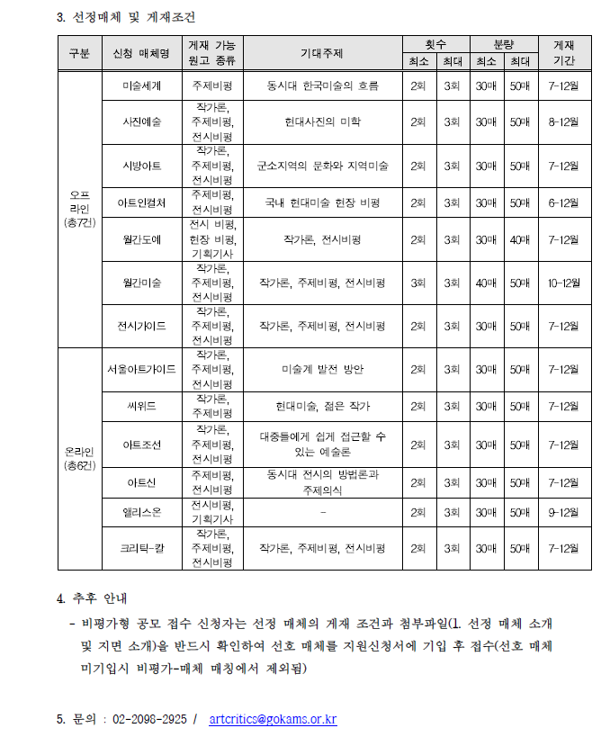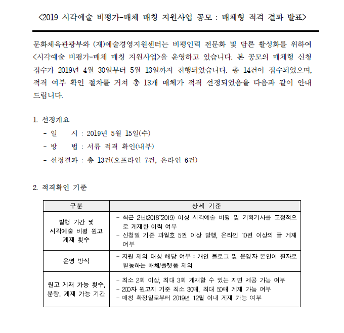 2019 시각예술 비평가-매체 매칭 지원사업 선정매체 공지