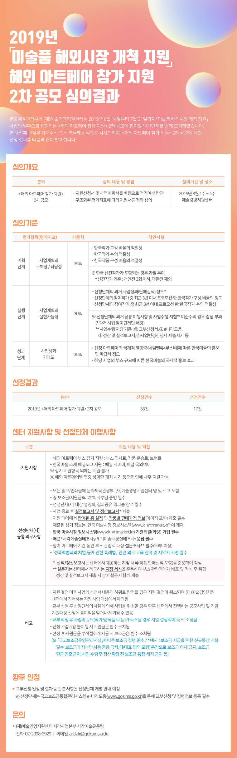 2019년 「미술품 해외시장 개척 지원」 사업 <해외 아트페어 참가 지원> 2차 공모 심의결과