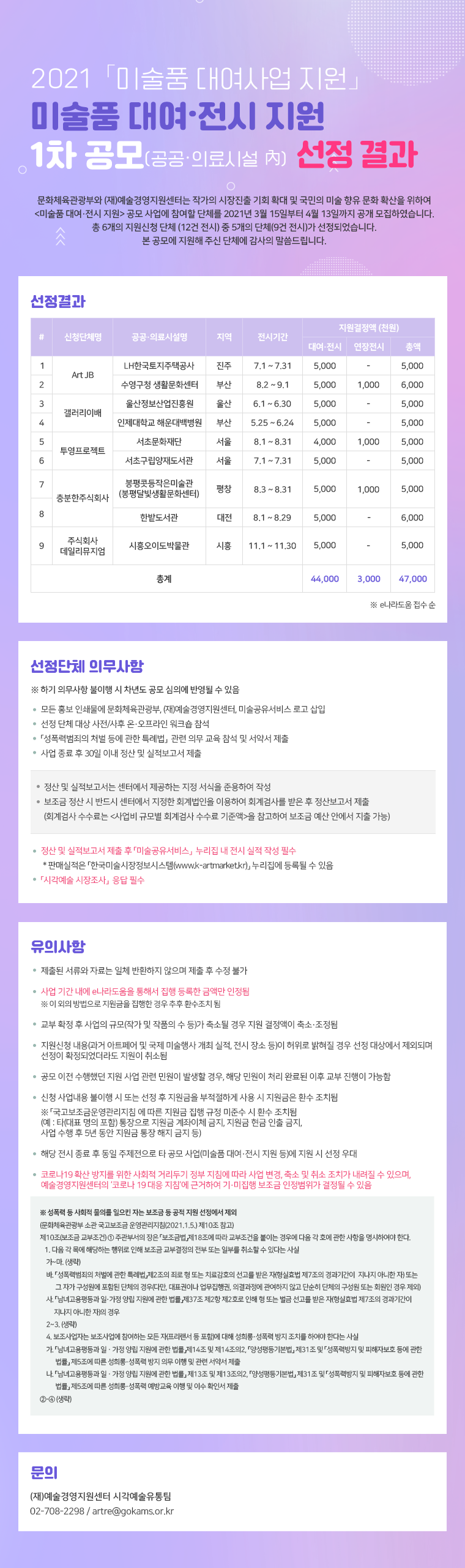 2021 미술품 대여사업 지원 - 미술품 대여·전시 지원 1차 공모 결과