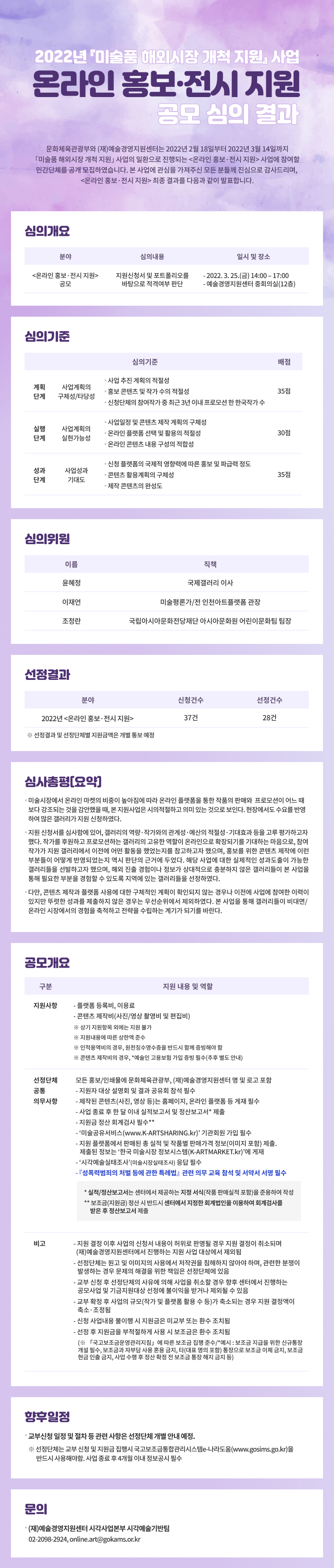 2022년 『미술품 해외시장 개척 지원』 온라인 홍보·전시 지원 공모 심의 결과