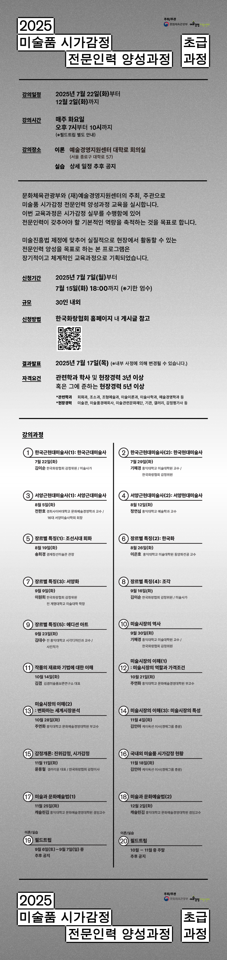 문화체육관광부와 (재)예술경영지원센터의 주최, 주관으로 미술품 시가감정 전문인력 양성과정 교육을 실시합니다.