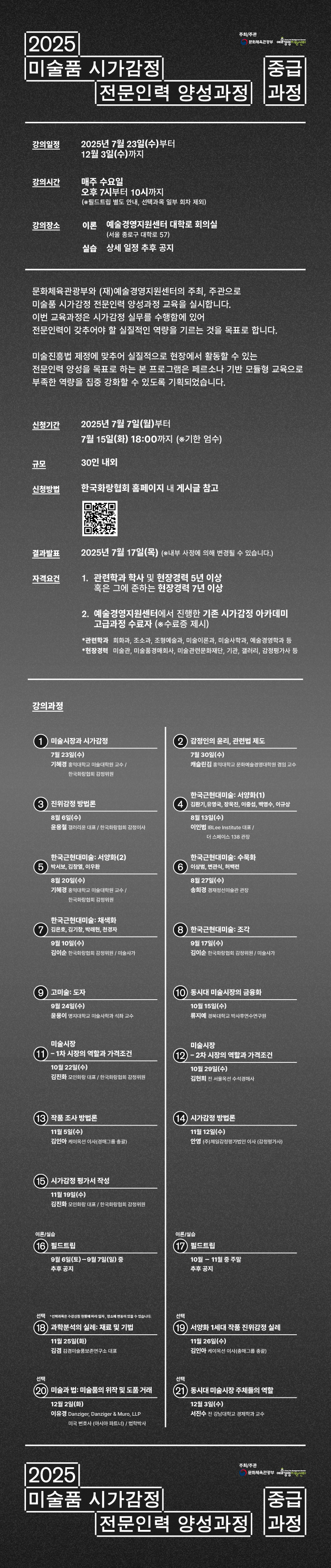문화체육관광부와 (재)예술경영지원센터의 주최, 주관으로 미술품 시가감정 전문인력 양성과정 교육을 실시합니다.