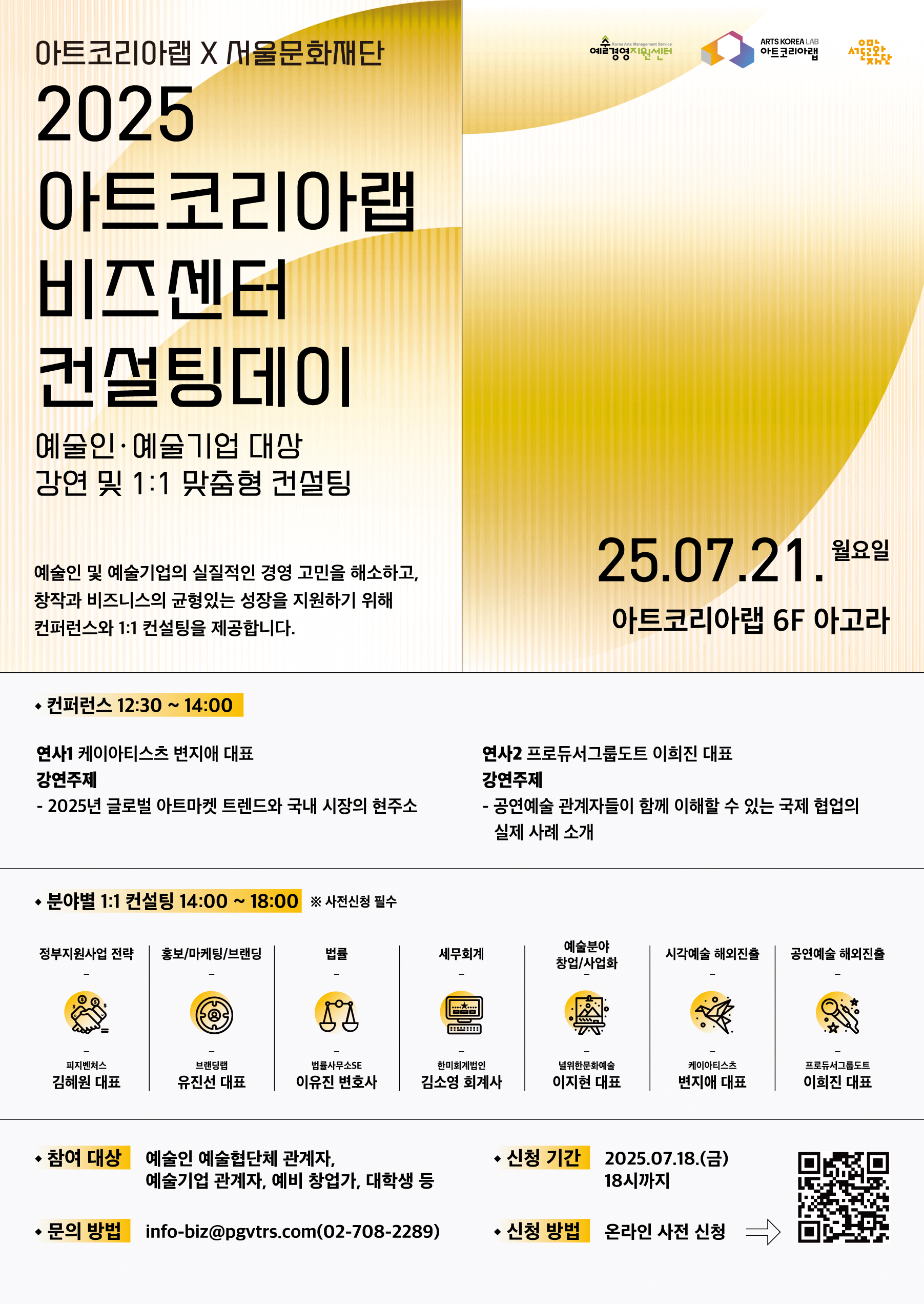 창작과 비즈니스의 균형 있는 성장을 지원하기 위해 ‘2025 아트코리아랩 비즈센터 컨설팅데이’를 개최합니다.