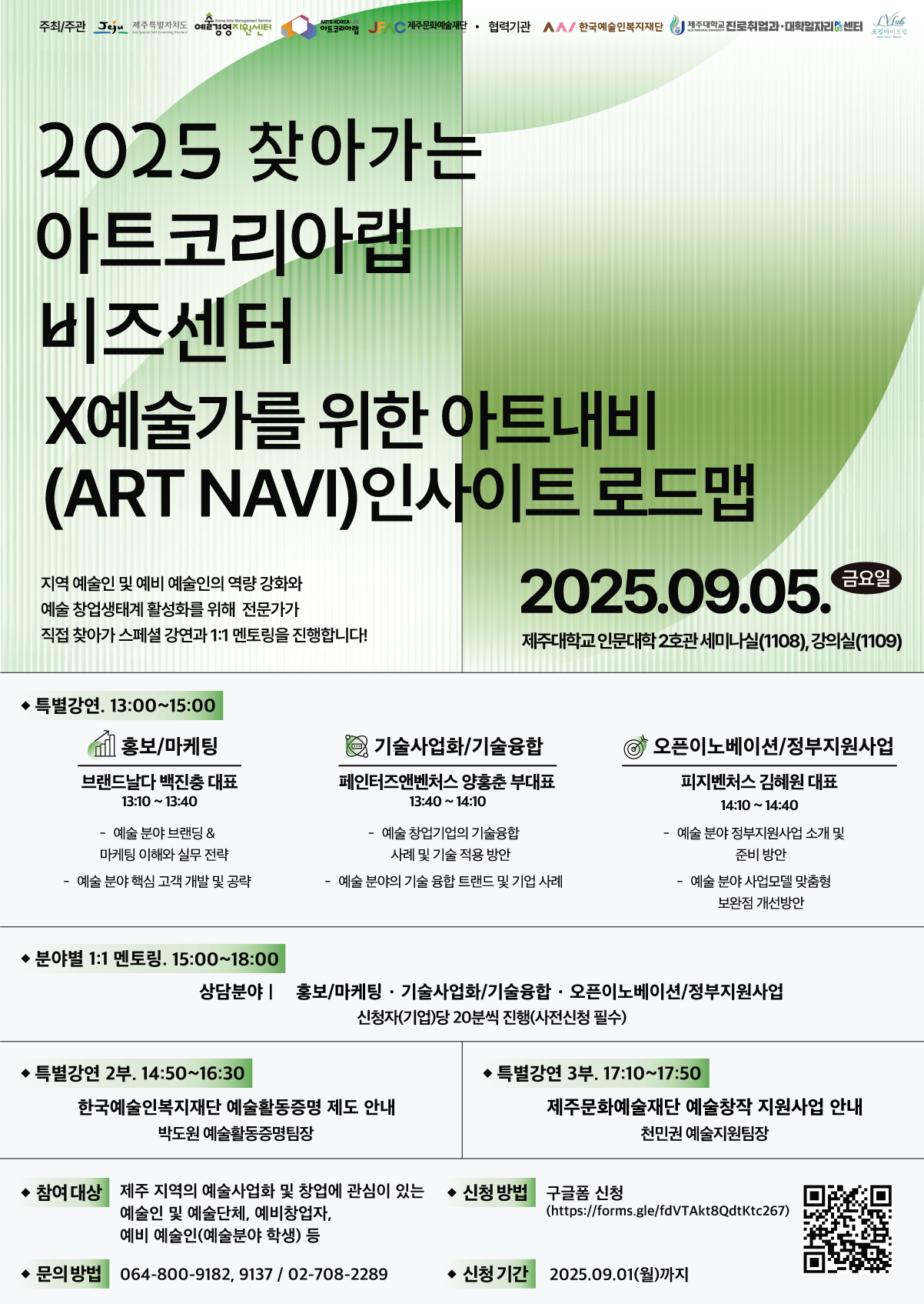 - 대상 : 제주 지역 내 예술인, 예술단체 대표자 및 실무자, 예비창업가 등