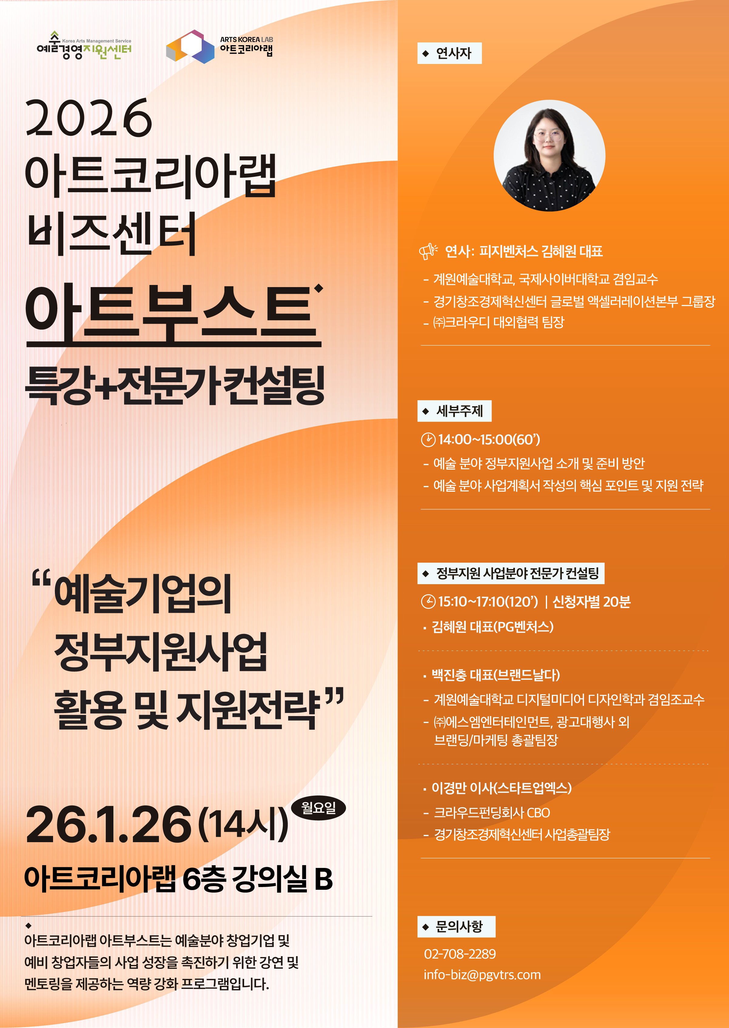 아트부스트란? 예술 분야 창업기업 및 예비 창업자들의 사업 성장을 촉진하기 위한 강연 및 멘토링을 제공하는 역량 강화 프로그램입니다.