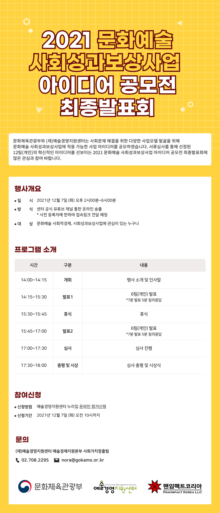 2021 문화예술 사회성과보상사업 아이디어 공모전 최종발표회 참가신청
