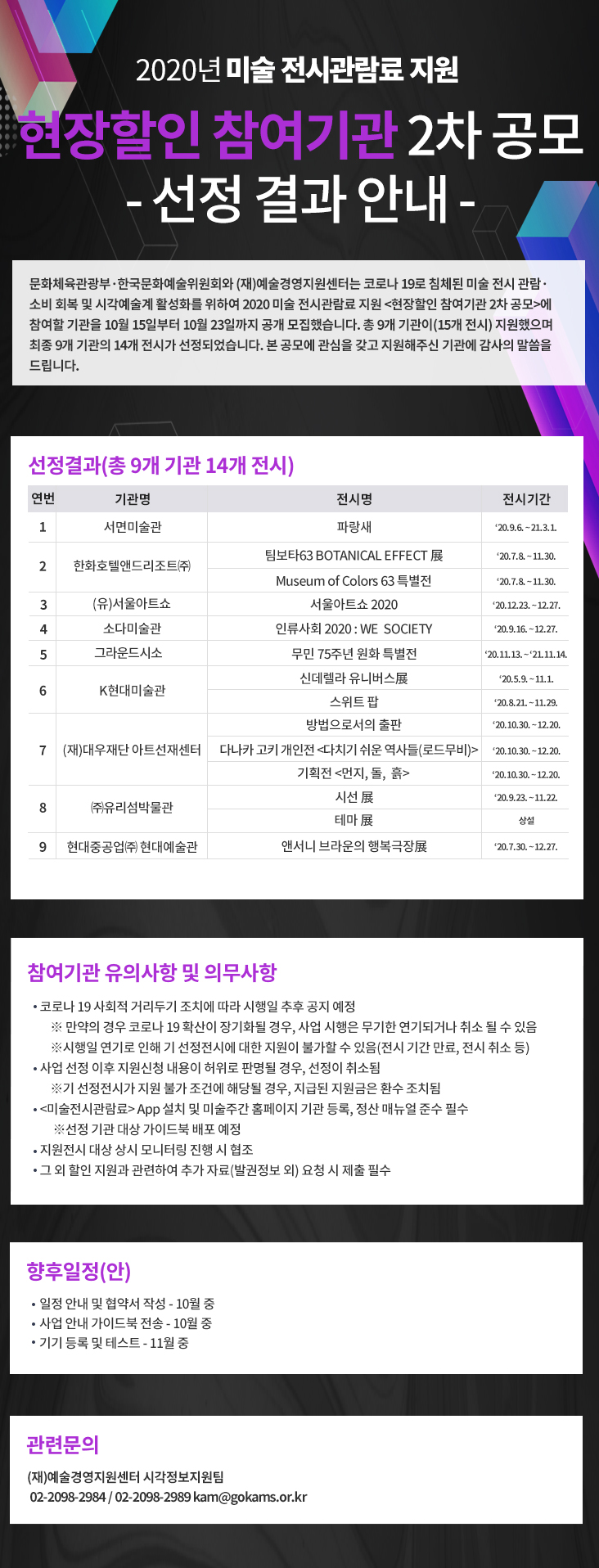 2020년 미술 전시관람료 지원 현장할인 참여기관 2차 공모 선정결과 안내