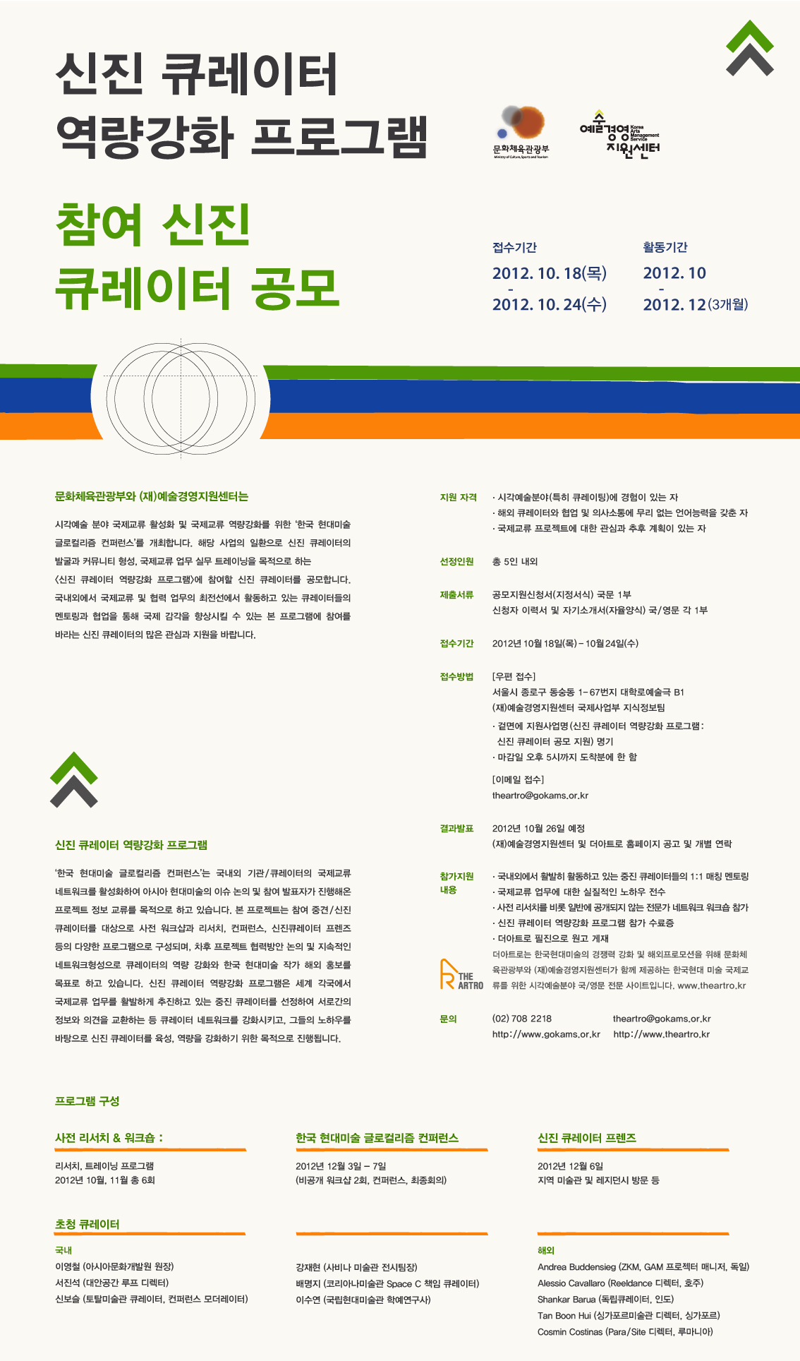 문화체육관광부와 (재)예술경영지원센터는 시각예술 분야 국제교류 활성화 및 국제교류 전문인력 역량강화를 위한 ‘한국 현대미술 글로컬리즘 컨퍼런스’를 개최합니다. 해당 사업의 일환으로 신진 큐레이터의 발굴과 커뮤니티 형성, 국제교류 업무 실무 트레이닝을 목적으로 하는 <신진 큐레이터 역량강화 프로그램>에 참여할 신진큐레이터를 공모합니다. 국내외에서 활발하게 활동하며 국제교류 및 협력 업무의 최전선에서 활동하고 있는 큐레이터들의 멘토링과 협업을 통해 국제 감각을 향상시킬 수 있는 본 프로그램에 참여를 바라는 신진 큐레이터의 많은 관심과 지원을 바랍니다.