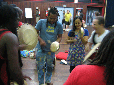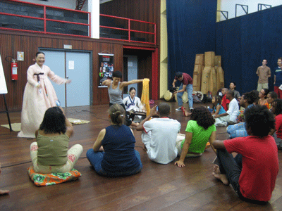 Through workshop, Chae Soo Jung and Sonagi Project with participation of Korean ethnomusicologist HA Ju-Yong met Brazilian artists and audience. The first part with Sonagi Project presented the history of Pungmul gut and Samulnori, Korea's percussion instruments and its rhythms. At the end was followed by the improvisational play with Brazilian percussion group BONGAR! The second part continued with Chae Soo Jung, explaining Korean folk opera PANSORI, the different musical characteristics varying from region to region in Korea, etc.