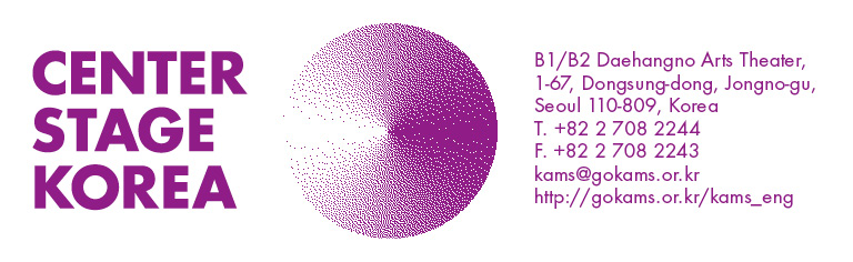 Centre Stage Korea is an international market and audience development effort for the Korean performing arts, initiated and organized by Korea Arts Management Service (KAMS) and supported by the Korean Ministry of Culture, Sports and Tourism. In partnership with various international arts centres and festivals, KAMS has designed Centre Stage Korea, an annual programme to support the international presence of the Korean performing arts. For 2010, KAMS is presenting a series of Centre Stage Korea performances, workshops and forums in South America (Brazil/Colombia, August to September), Australia (Adelaide/Darwin/Melbourne/Sydney, August to October), Georgia (Tbilisi, October) and the USA (New York, January 2011).