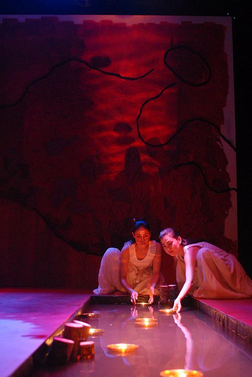 The audience waited with bated breath as they were drawn into the semi-darkened stage that silently held musicians sitting still, facing each other, perfectly reposed, against the dramatic blood-red backdrop with what looked like an umbilical cord holding the set together seamlessly. In the half light of what could be either the moon or the sun that shone across the stage and lit a pale gleam on the quiet water body that divided the stage and the musicians on either side, was the centre stage, expectant of the action that was about to unfold. High up above the stage, against a black strip of cloth, shone as surtitles, the words ‘Medea and its Double’. The silence was soulful, reflective, promising. As the bell broke the shrine-like silence, reinforcing from the start the very Eastern moorings of this production, I sat with the audience at the close of the annual Hindu Metroplus Theatre Festival in Chennai, taking in this atmosphere and wondering how our selection of a Korean interpretation of a Greek classic, in Korean, with English surtitles, would work with a text savvy theatre-loving audience in Southern India.